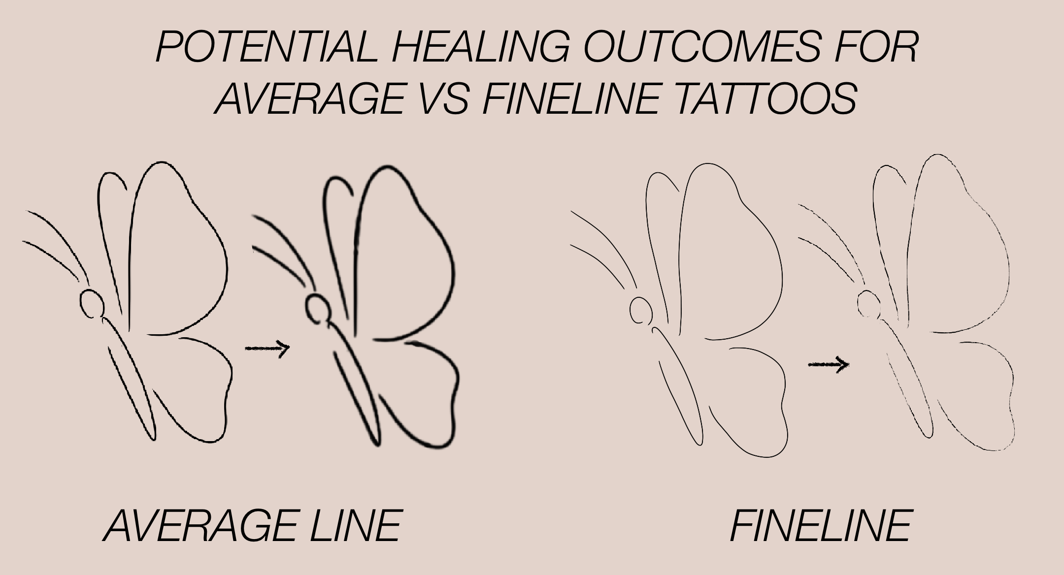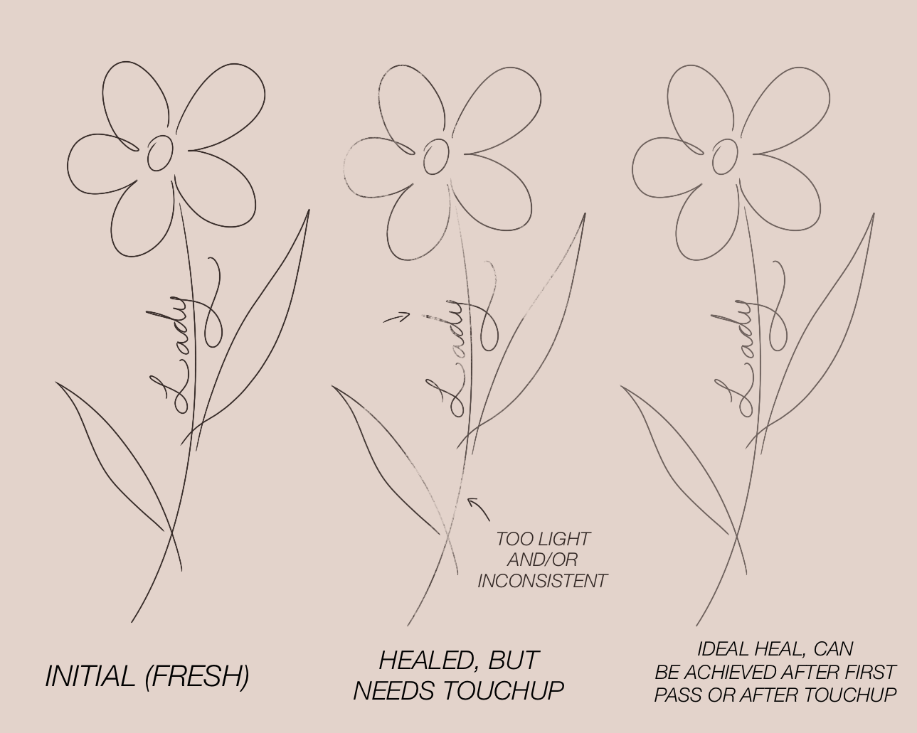 For Fineline, the ultimate goal is that their longterm look remains light, soft, and legible. Fineline tattoos, if done correctly, will always become more light before blowing out/being very dark. Sometimes they can heal too light or inconsistently, which will require an initial touchup to achieve their desired appearance.